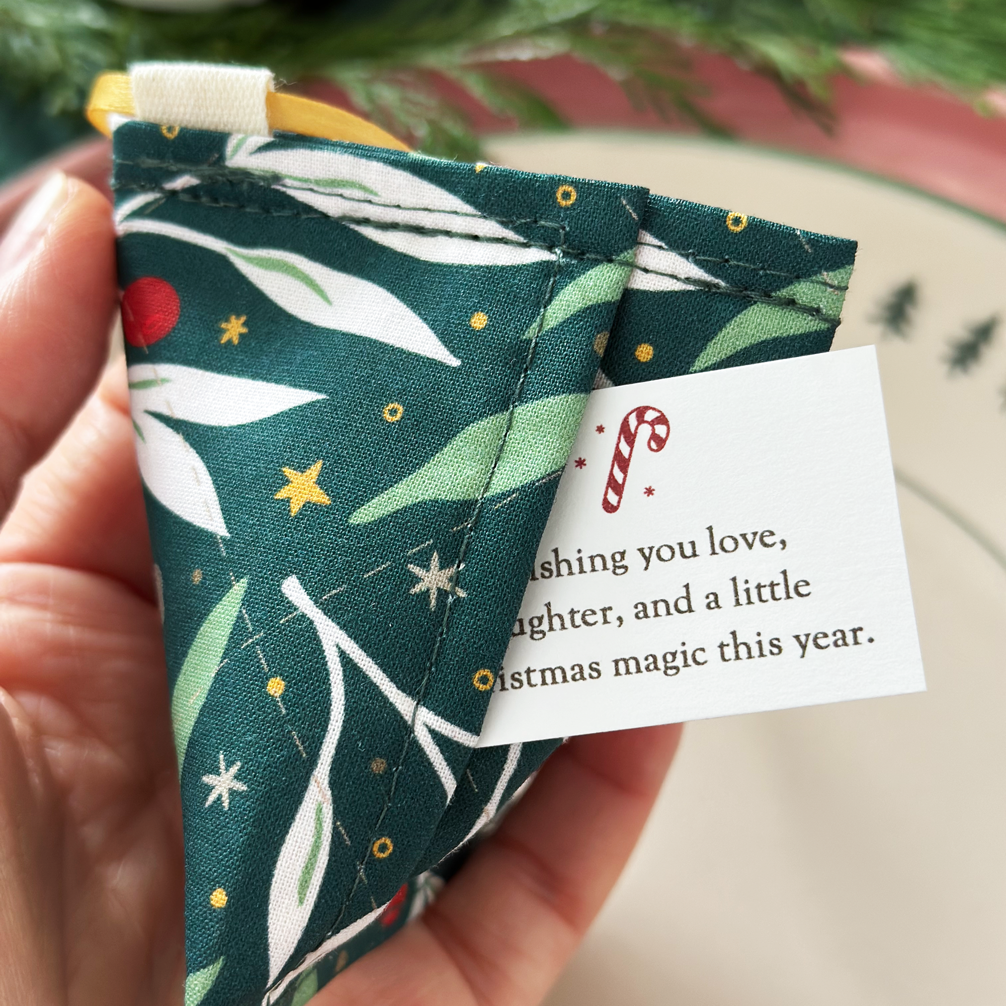 Inside each fabric fortune cookie, you’ll find a tiny Christmas wish card included. There’s even room for an extra surprise - a chocolate coin, a festive pin badge, or a note of love.