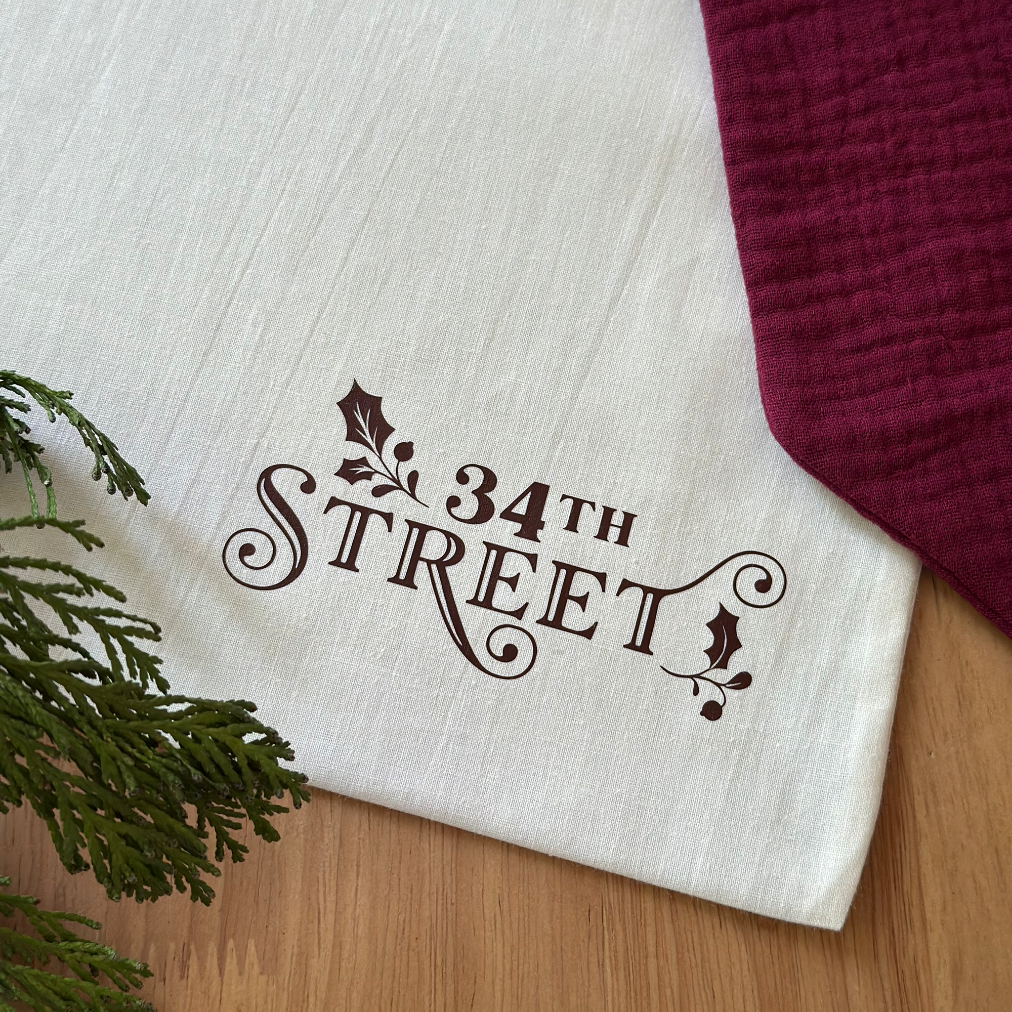 A handmade Christmas bow made from deep burgundy cotton with the words "The Laurences" on one tail is hung from a black mantlepiece that is decorated for Christmas with greenery, orange slice garland, and candles.